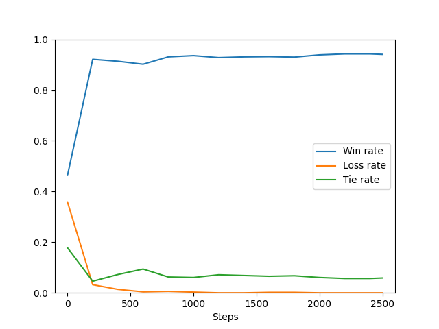 By about 1200 steps the model never loses to a random player and for the rest of training the fraction of ties decreases a bit.